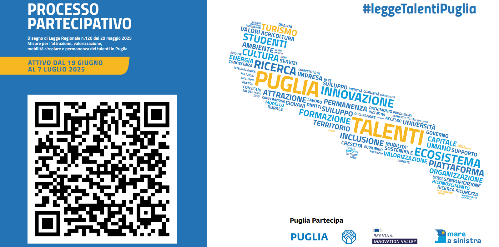 La Regione Puglia ha avviato il Processo Partecipativo relativo al Disegno di Legge n. 120, approvato dalla Giunta Regionale lo scorso 29 maggio, che mira a definire “Misure per l’attrazione, valorizzazione, mobilità circolare e permanenza dei talenti in Puglia”, in coerenza con la strategia regionale #mareAsinistra.