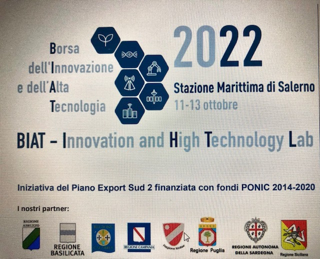Nell'ambito della Programmazione 2022 del Piano Export Sud 2, Agenzia ICE organizza un incoming di operatori esteri alla BIAT 2022, in programma dall'11 al 13 ottobre 2022 a Salerno, iniziativa promozionale a vantaggio di startup, università e centri di ricerca con sede operativa nelle Regioni del Sud Italia attive nei seguenti settori: