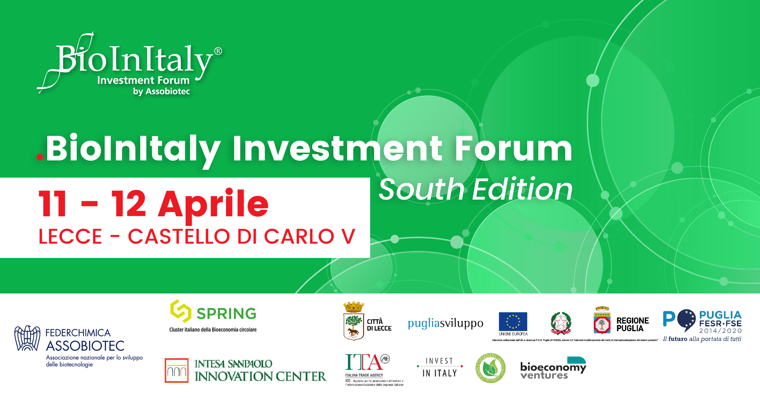 Il Forum, nella sua nuova versione “South Edition” si tiene nella prestigiosa cornice del Castello Carlo V di Lecce. Organizzato da Federchimica Assobiotec, Cluster Nazionale della Bioeconomia circolare Spring e Intesa Sanpaolo Innovation Center, in collaborazione con Regione Puglia, Puglia Sviluppo e con il supporto di ITA, Invest in Italy, LGCA e Bioeconomy Ventures, punta a presentare i progressi e le opportunità di investimento e di sviluppo, soprattutto nel campo della bioeconomia circolare, anche per le imprese del Sud.
