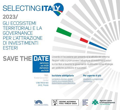 Martedì 24 e mercoledì 25 gennaio 2023 presso il Convention Center del Porto Vecchio di Trieste si svolge la prima edizione dell’evento “Selecting Italy - Gli ecosistemi territoriali e la governance per l’attrazione di investimenti esteri”, organizzato dalla Conferenza delle Regioni e delle Province autonome in collaborazione con la Regione Friuli-Venezia Giulia. Selecting Italy è l’occasione per presentare le attività del sistema Regioni volte a promuovere l’attrazione di investimenti esteri sui territori e favorire la governance multilivello come strategia per politiche pubbliche di successo.
