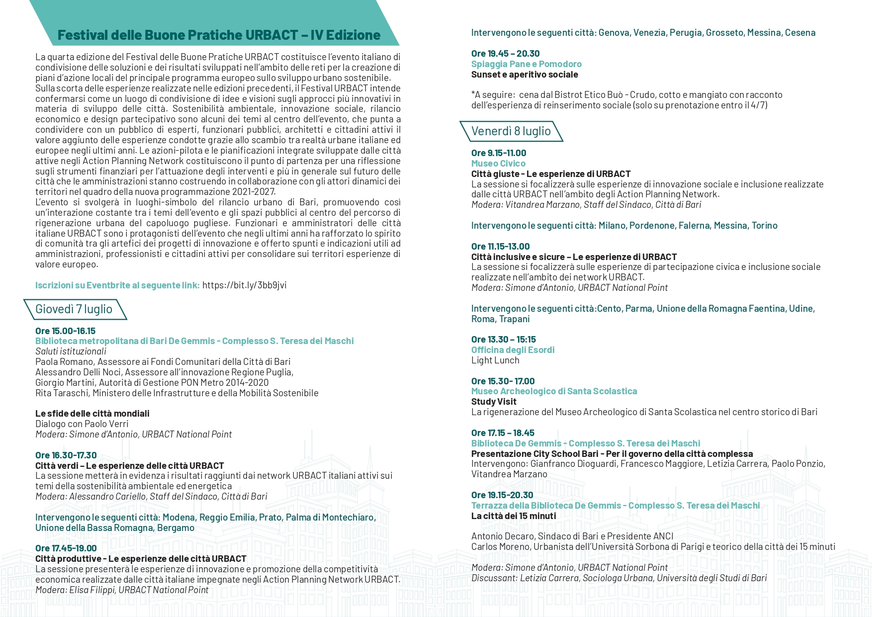 Articolata in 4 sessioni interattive, due keynote speech, visite studio ai luoghi simbolo della rigenerazione urbana di Bari e momenti di networking, la manifestazione si svolgerà nei luoghi-simbolo del rilancio urbano di Bari, promuovendo così un’interazione costante tra i temi dell’evento e gli spazi pubblici al centro del percorso di rigenerazione urbana del capoluogo pugliese.